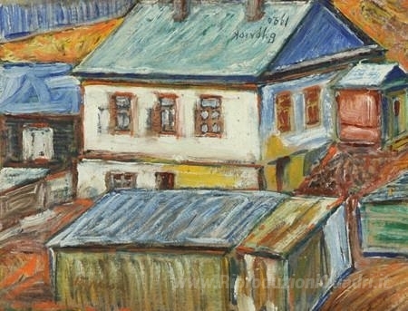 Ti offriamo una riproduzione artigianale su tela dell'opera famosa 'Tetti in Siberia' di David Burliuk, dal Museo delle Riproduzioni.