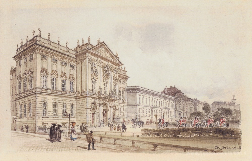 Ti offriamo una riproduzione artigianale su tela dell'opera famosa 'Trautson Palace di Vienna' di Rudolf von Alt, dal Museo delle Riproduzioni.