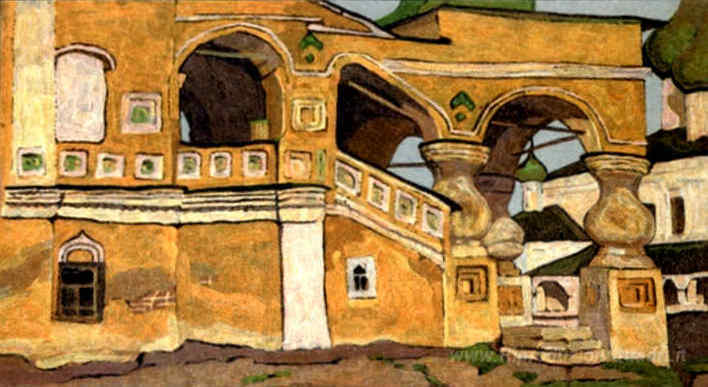 Ti offriamo una riproduzione artigianale su tela dell'opera famosa 'Uglich. Portico.' di Nicholas Roerich, dal Museo delle Riproduzioni.