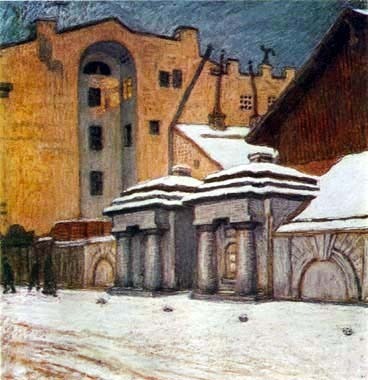 Ti offriamo una riproduzione artigianale su tela dell'opera famosa 'Un angolo di Pietroburgo' di Mstislav Dobuzhinsky, dal Museo delle Riproduzioni.