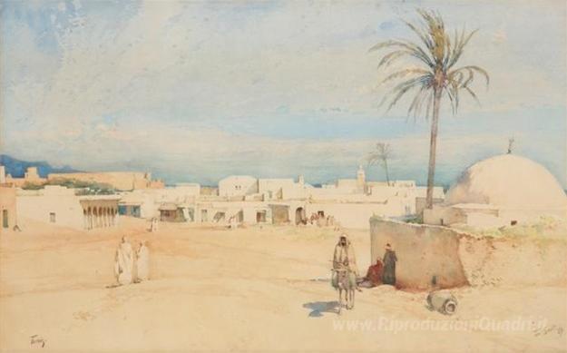 Ti offriamo una riproduzione artigianale su tela dell'opera famosa 'Una Piazza del Mercato a Tunisi, sera' di Tom Scott, dal Museo delle Riproduzioni.