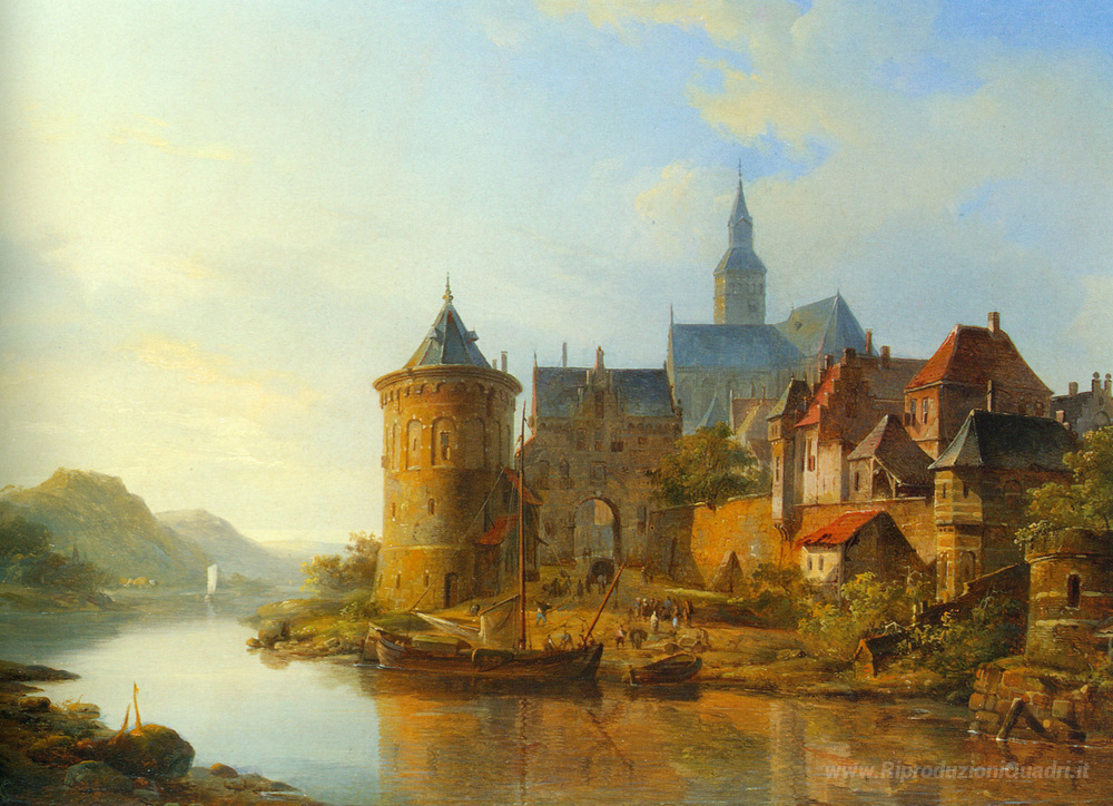Ti offriamo una riproduzione artigianale su tela dell'opera famosa 'Una vista di una Città lungo il Reno' di Cornelis Springer, dal Museo delle Riproduzioni.