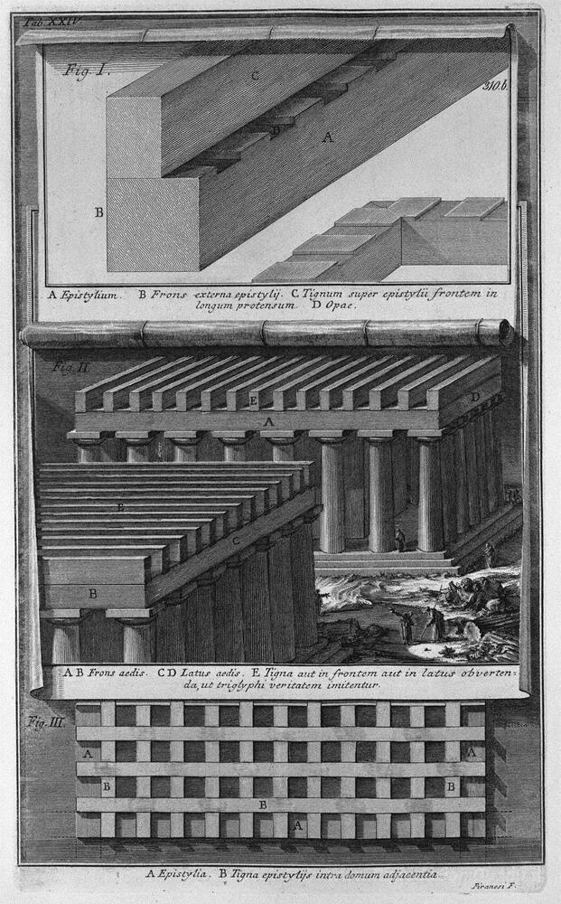 Ti offriamo una riproduzione artigianale su tela dell'opera famosa 'Un'altra prospettiva e dettagli del Tempio Dorico' di Giovanni Battista Piranesi, dal Museo delle Riproduzioni.