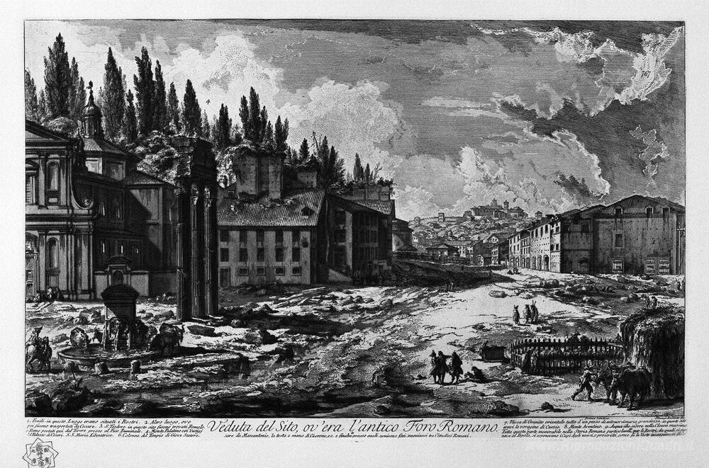 Ti offriamo una riproduzione artigianale su tela dell'opera famosa 'Veduta del luogo dove era l'antico Foro romano' di Giovanni Battista Piranesi, dal Museo delle Riproduzioni.