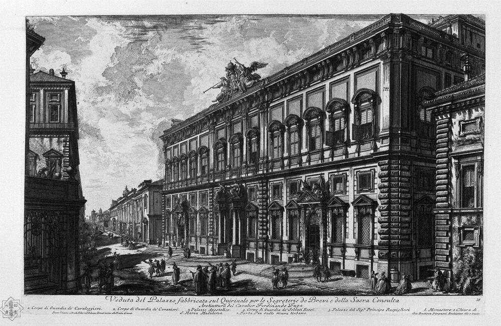 Ti offriamo una riproduzione artigianale su tela dell'opera famosa 'Veduta del Palazzo Farnese' di Giovanni Battista Piranesi, dal Museo delle Riproduzioni.