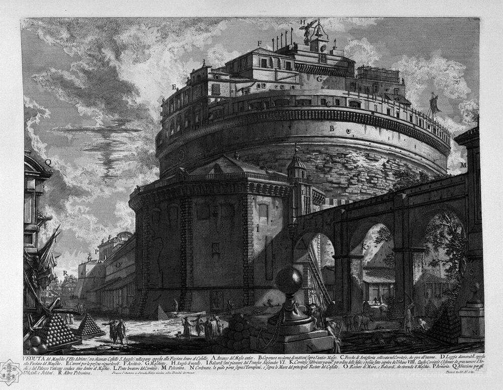 Ti offriamo una riproduzione artigianale su tela dell'opera famosa 'Veduta del Ponte e Castel Sant'Angelo' di Giovanni Battista Piranesi, dal Museo delle Riproduzioni.