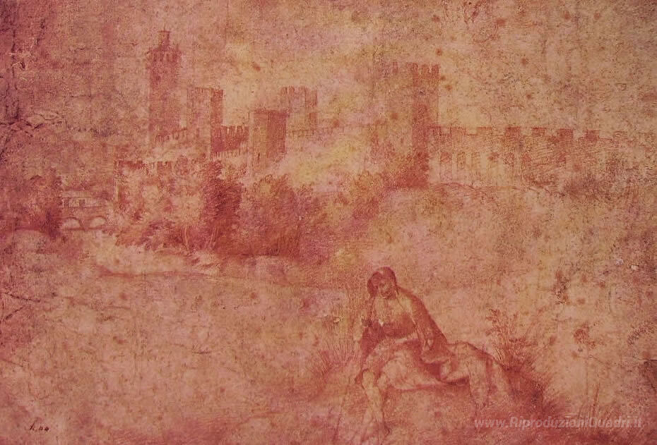 Ti offriamo una riproduzione artigianale su tela dell'opera famosa 'Veduta di Castelfranco e pastore' di Giorgione, dal Museo delle Riproduzioni.