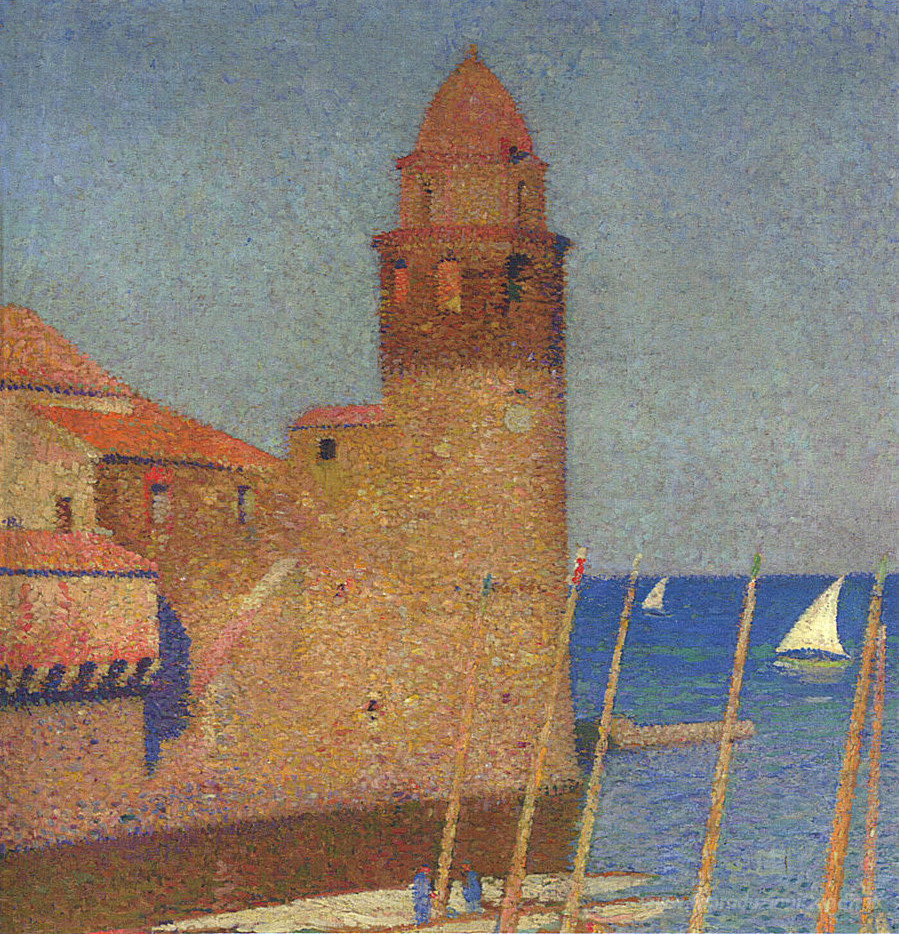 Ti offriamo una riproduzione artigianale su tela dell'opera famosa 'Veduta di Collioure' di Henri Martin, dal Museo delle Riproduzioni.