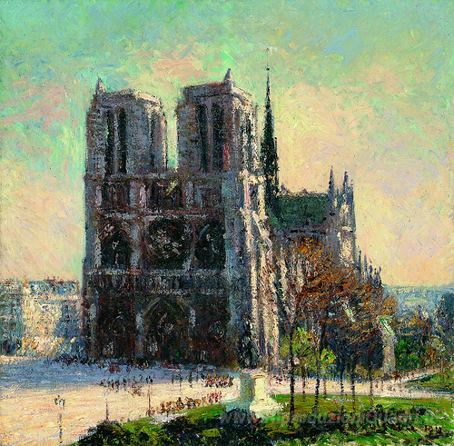 Ti offriamo una riproduzione artigianale su tela dell'opera famosa 'Veduta di Notre Dame' di Gustave Loiseau, dal Museo delle Riproduzioni.