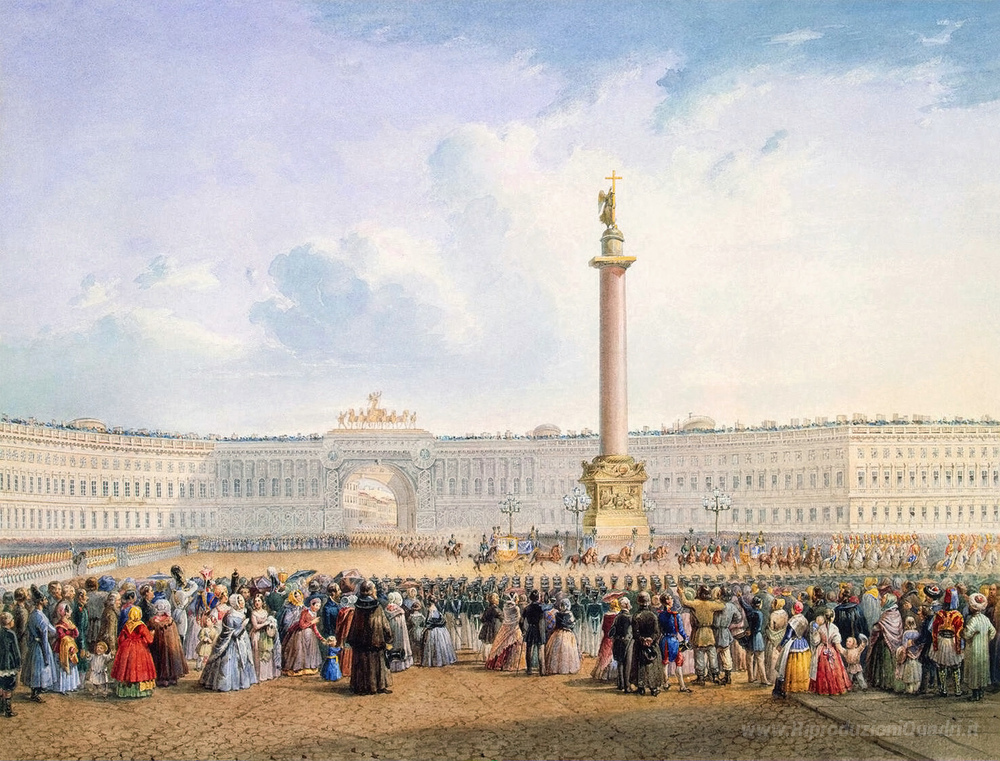 Ti offriamo una riproduzione artigianale su tela dell'opera famosa 'Veduta di Piazza del Palazzo e il Quartier Generale Building di ' di Vasily Sadovnikov, dal Museo delle Riproduzioni.