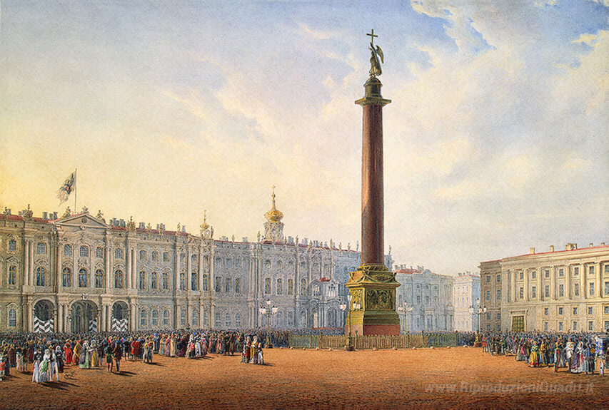 Scoprite l'eleganza senza tempo del dipinto Veduta di Piazza del Palazzo e Palazzo d'Inverno a San Pietroburgo dell’artista Vasily Sadovnikov. Questa straordinaria opera cattura non solo la magnificenza architettonica del Palazzo d’Inverno, ma anche l'atmosfera vivace e suggestiva della piazza circostante. Sadovnikov, noto per il suo talento nella rappresentazione di paesaggi urbani, utilizza una palette ricca di colori caldi e tonalità realistiche, rendendo ogni dettaglio vivido e coinvolgente.