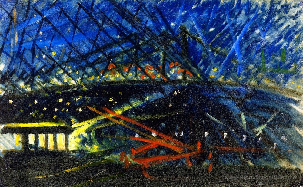 Ti offriamo una riproduzione artigianale su tela dell'opera famosa 'Veduta notturna di Ponte di Brooklyn' di Joseph Stella, dal Museo delle Riproduzioni.