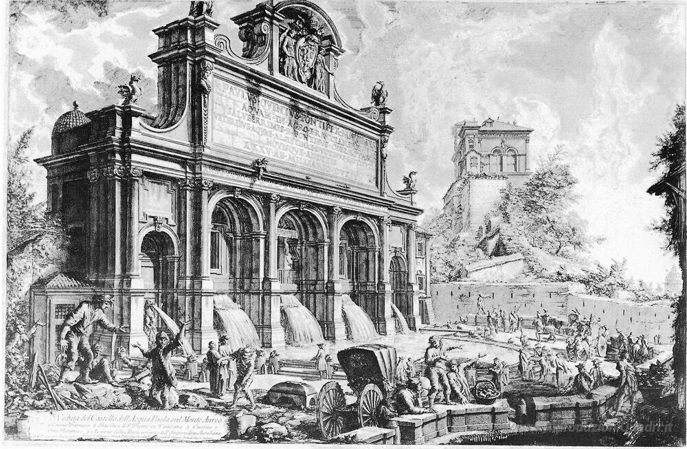 Ti offriamo una riproduzione artigianale su tela dell'opera famosa 'Vedute di Roma' di Giovanni Battista Piranesi, dal Museo delle Riproduzioni.