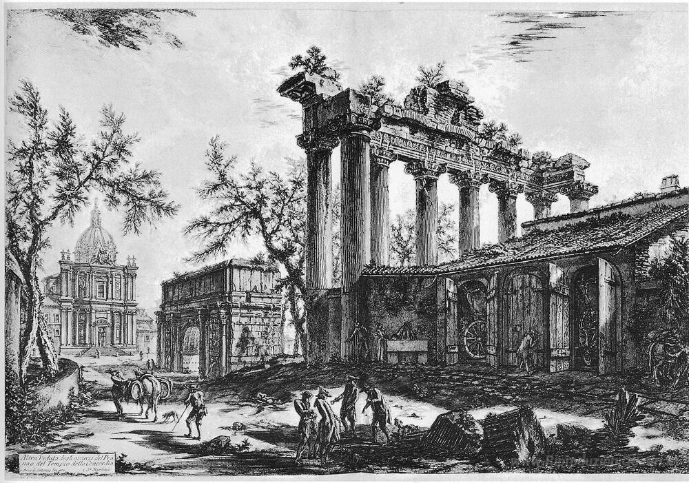 Ti offriamo una riproduzione artigianale su tela dell'opera famosa 'Vedute di Roma' di Giovanni Battista Piranesi, dal Museo delle Riproduzioni.