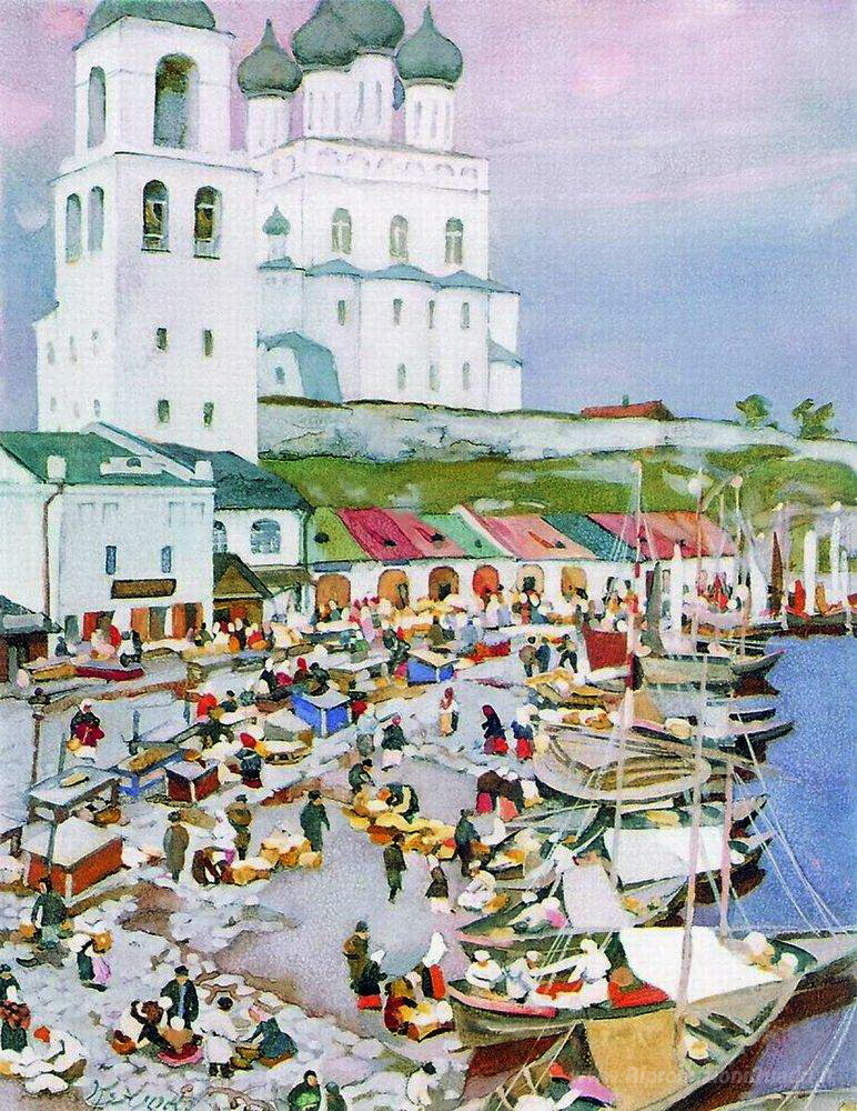 Ti offriamo una riproduzione artigianale su tela dell'opera famosa 'Vicino Cathederal del Pskov' di Konstantin Yuon, dal Museo delle Riproduzioni.