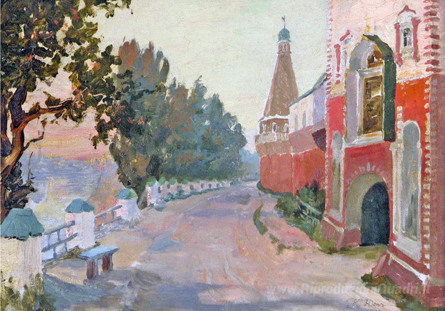 Ti offriamo una riproduzione artigianale su tela dell'opera famosa 'Vicino Monastero di Simon' di Konstantin Yuon, dal Museo delle Riproduzioni.
