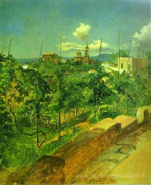 Ti offriamo una riproduzione artigianale su tela dell'opera famosa 'Vigna al Vico' di Nikolai Ge, dal Museo delle Riproduzioni.