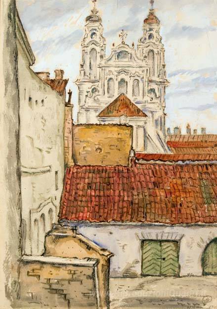 Ti offriamo una riproduzione artigianale su tela dell'opera famosa 'Vilnius. Chiesa di Santa Caterina.' di Mstislav Dobuzhinsky, dal Museo delle Riproduzioni.