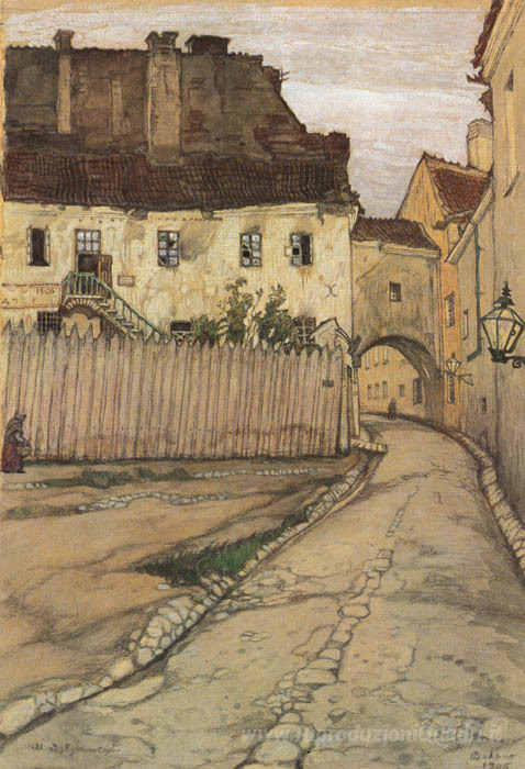 Ti offriamo una riproduzione artigianale su tela dell'opera famosa 'Vilno. Street.' di Mstislav Dobuzhinsky, dal Museo delle Riproduzioni.