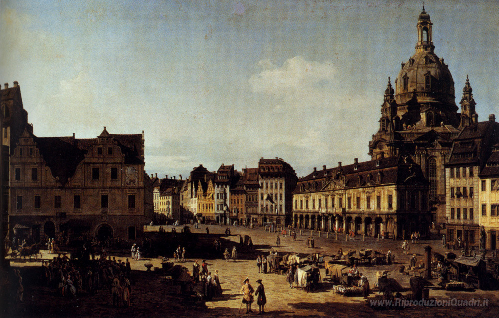 Ti offriamo una riproduzione artigianale su tela dell'opera famosa 'Vista del Nuovo Mercato a Dresda dal Moritzstrasse' di Bernardo Bellotto, dal Museo delle Riproduzioni.
