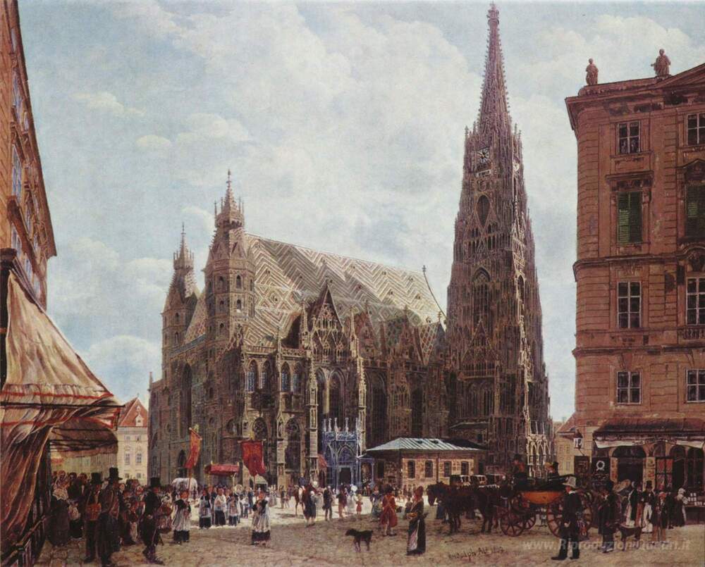 Ti offriamo una riproduzione artigianale su tela dell'opera famosa 'Vista del Stephansdom da Archivio im Eisen Platz' di Rudolf von Alt, dal Museo delle Riproduzioni.
