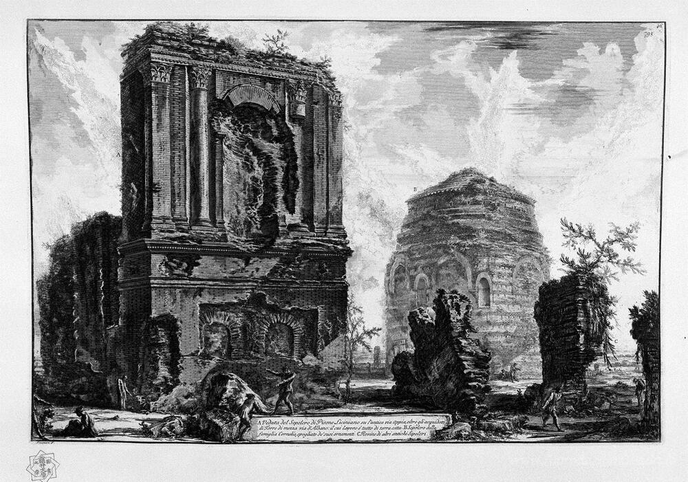 Ti offriamo una riproduzione artigianale su tela dell'opera famosa 'Vista della Tomba di Piso Liciniano dell'antica via Appia, al di' di Giovanni Battista Piranesi, dal Museo delle Riproduzioni.