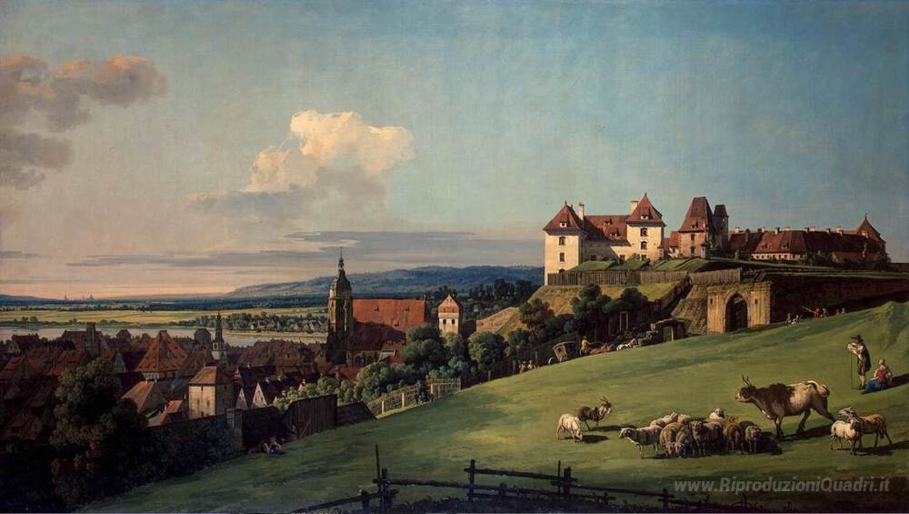 Ti offriamo una riproduzione artigianale su tela dell'opera famosa 'Vista di Pirna dal castello Sonnenstein' di Bernardo Bellotto, dal Museo delle Riproduzioni.