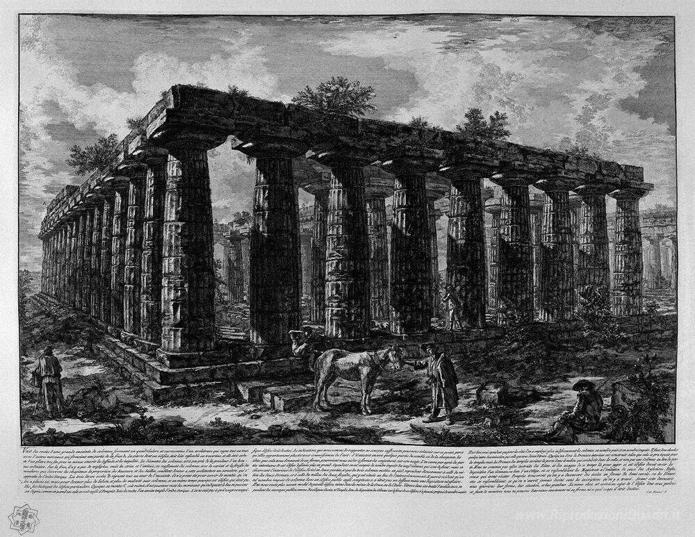 Ti offriamo una riproduzione artigianale su tela dell'opera famosa 'Vista di un colonnato che formano un quadrilatero' di Giovanni Battista Piranesi, dal Museo delle Riproduzioni.