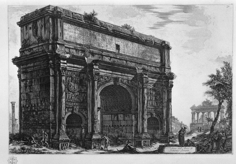 Ti offriamo una riproduzione artigianale su tela dell'opera famosa 'Vista l'Arco di Settimio Severo' di Giovanni Battista Piranesi, dal Museo delle Riproduzioni.