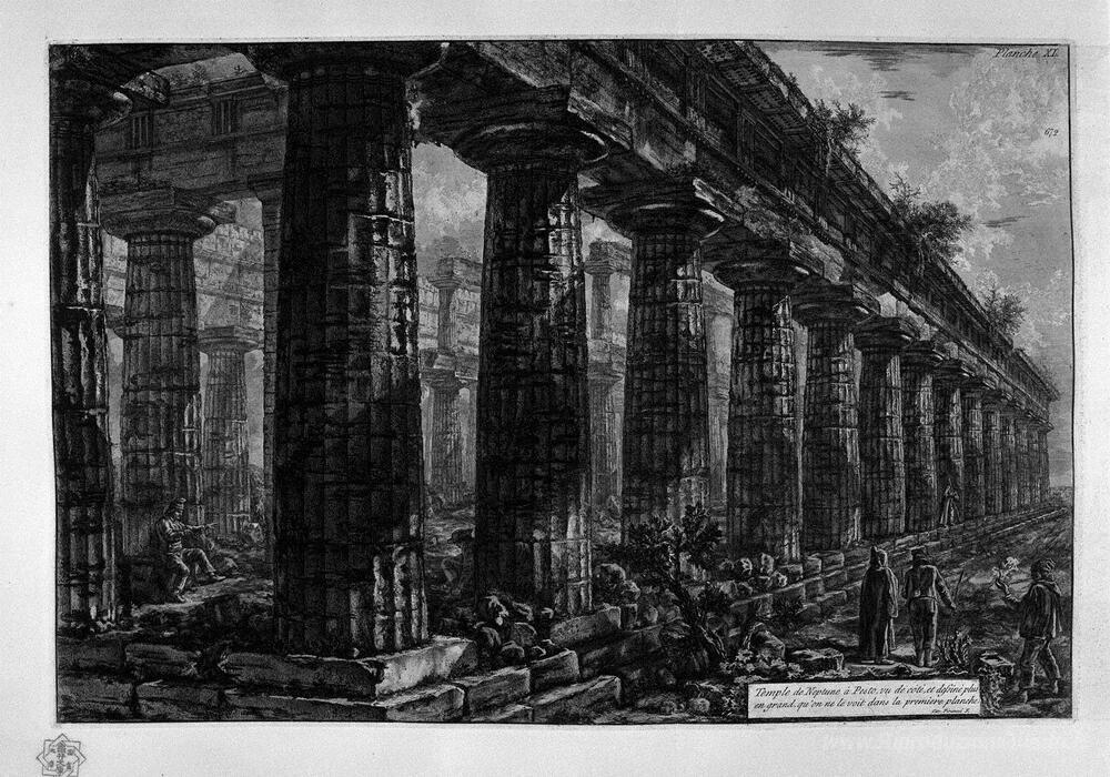 Ti offriamo una riproduzione artigianale su tela dell'opera famosa 'Vista laterale del tempio' di Giovanni Battista Piranesi, dal Museo delle Riproduzioni.
