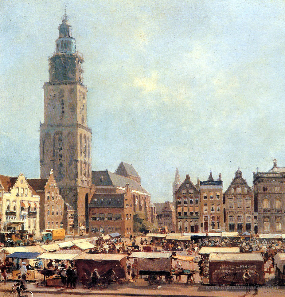 Ti offriamo una riproduzione artigianale su tela dell'opera famosa 'Vista sul mercato a Groningen' di Cornelis Vreedenburgh, dal Museo delle Riproduzioni.