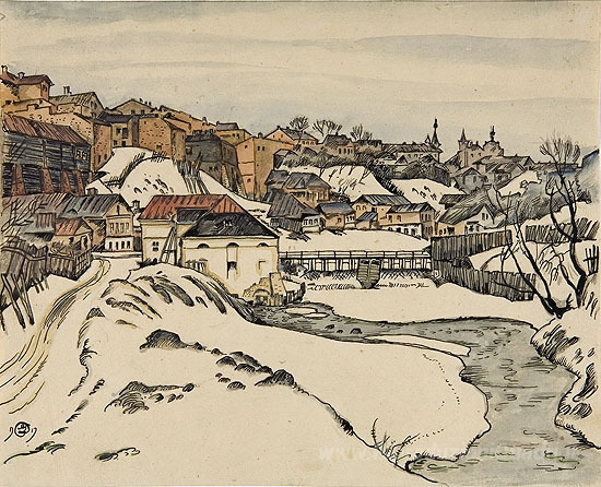 Ti offriamo una riproduzione artigianale su tela dell'opera famosa 'Vitebsk' di Mstislav Dobuzhinsky, dal Museo delle Riproduzioni.