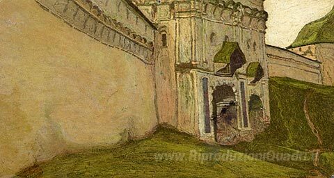 Ti offriamo una riproduzione artigianale su tela dell'opera famosa 'Zvenigorod. Porta Santa.' di Nicholas Roerich, dal Museo delle Riproduzioni.