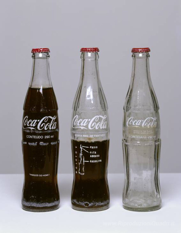 Ti offriamo una riproduzione artigianale su tela dell'opera famosa 'Inserimenti in circuiti ideologiche: progetto Coca-Cola' di Cildo Meireles, dal Museo delle Riproduzioni.