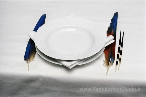Ti offriamo una riproduzione artigianale su tela dell'opera famosa 'Origine del Galateo a tavola' di Lothar Baumgarten, dal Museo delle Riproduzioni.