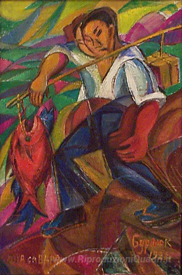 Ti offriamo una riproduzione artigianale su tela dell'opera famosa 'Giappone pescatore' di David Burliuk, dal Museo delle Riproduzioni.