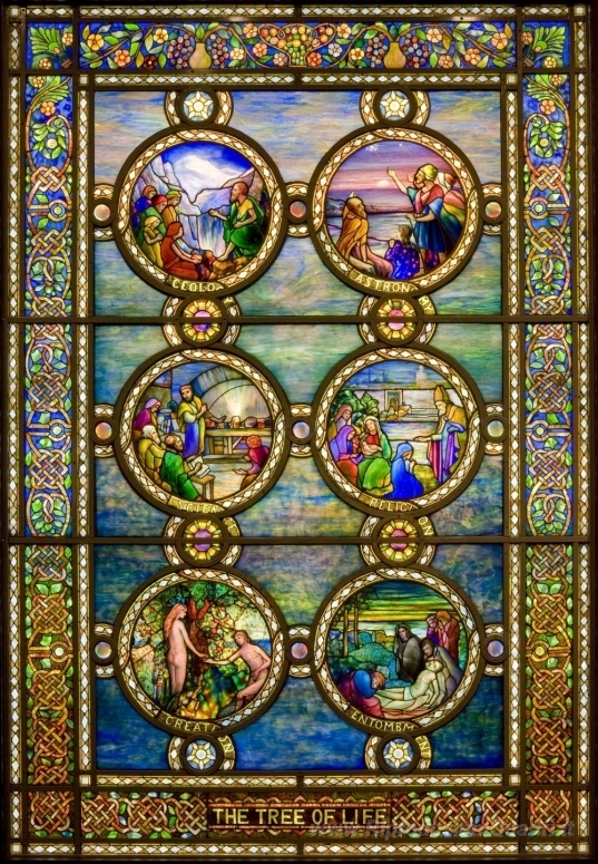 Ti offriamo una riproduzione artigianale su tela dell'opera famosa 'Albero della Vita finestra' di Louis Comfort Tiffany, dal Museo delle Riproduzioni.
