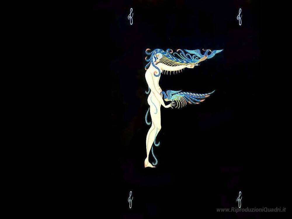 Ti offriamo una riproduzione artigianale su tela dell'opera famosa 'Alfabeto F' di Erte, dal Museo delle Riproduzioni.