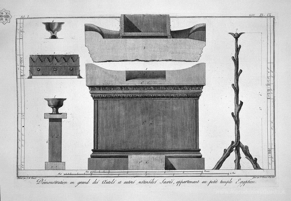 Ti offriamo una riproduzione artigianale su tela dell'opera famosa 'Altare e sacri arredi del tempio egiziano' di Giovanni Battista Piranesi, dal Museo delle Riproduzioni.