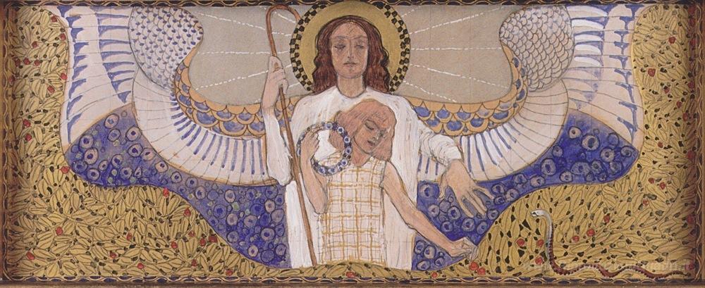 Ti offriamo una riproduzione artigianale su tela dell'opera famosa 'Am Steinhof Chiesa, Design per l'altare laterale destro Angelo C' di Koloman Moser, dal Museo delle Riproduzioni.