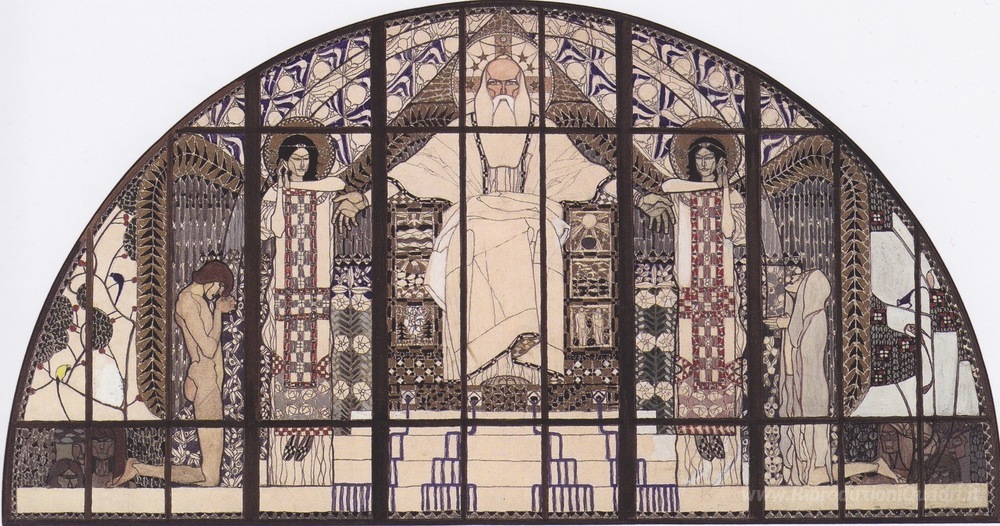 Ti offriamo una riproduzione artigianale su tela dell'opera famosa 'Am Steinhof Chiesa, schizzo colorato di finestra a sud' di Koloman Moser, dal Museo delle Riproduzioni.