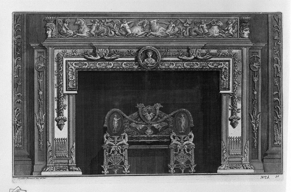 Ti offriamo una riproduzione artigianale su tela dell'opera famosa 'Camino che ha un secondo piano sul fregio di delfini putti Caval' di Giovanni Battista Piranesi, dal Museo delle Riproduzioni.