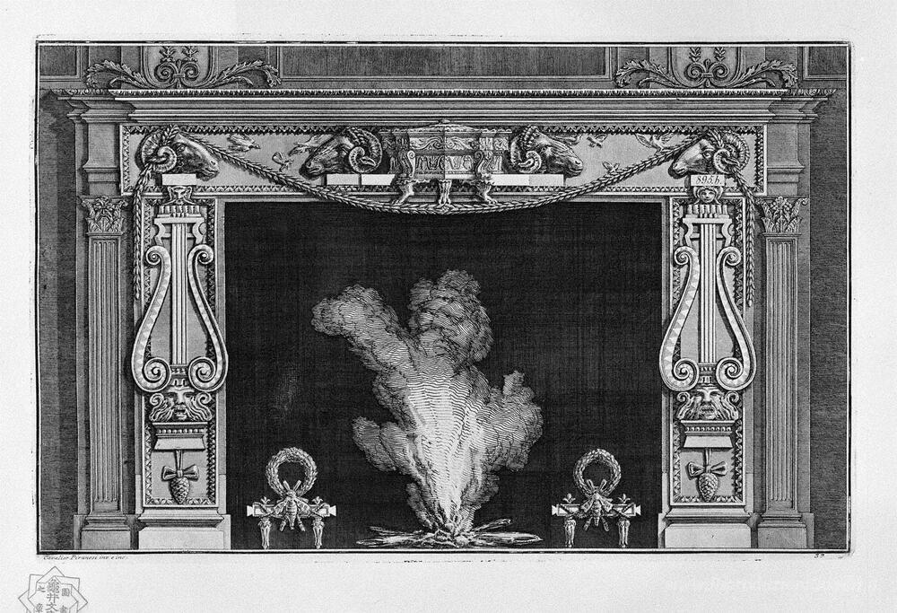 Ti offriamo una riproduzione artigianale su tela dell'opera famosa 'Camino con due grandi lire ai lati, e le quattro teste rams` nel' di Giovanni Battista Piranesi, dal Museo delle Riproduzioni.