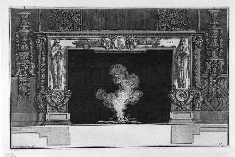 Ti offriamo una riproduzione artigianale su tela dell'opera famosa 'Camino con figure drappeggiate e corni di abbondanza sui fianchi' di Giovanni Battista Piranesi, dal Museo delle Riproduzioni.