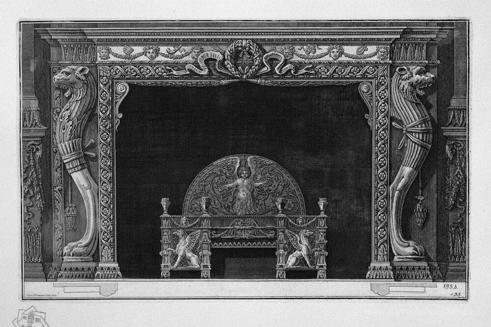 Ti offriamo una riproduzione artigianale su tela dell'opera famosa 'Camino: due lati delle zampe di leone testa di pozzo di un leone' di Giovanni Battista Piranesi, dal Museo delle Riproduzioni.