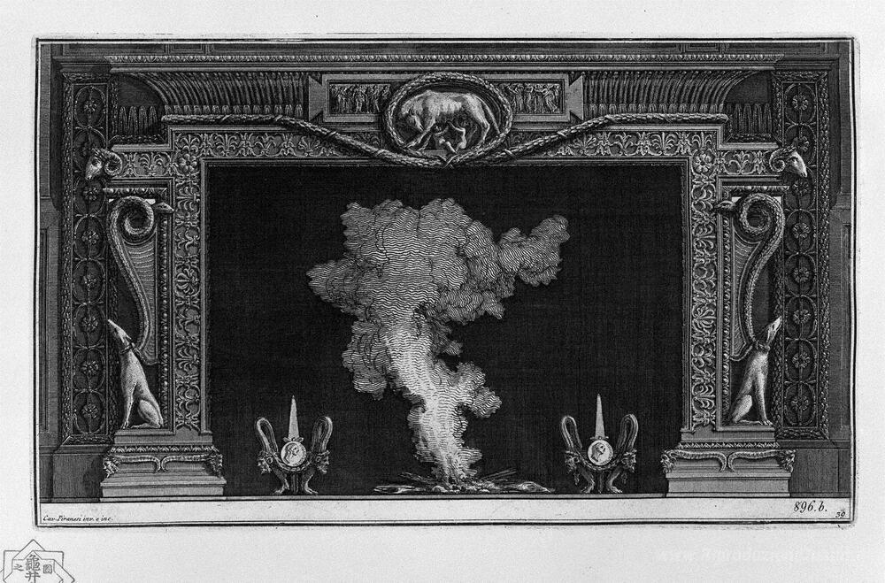 Ti offriamo una riproduzione artigianale su tela dell'opera famosa 'Camino, due levrieri, accovacciata, sui lati, e la lupa romana n' di Giovanni Battista Piranesi, dal Museo delle Riproduzioni.
