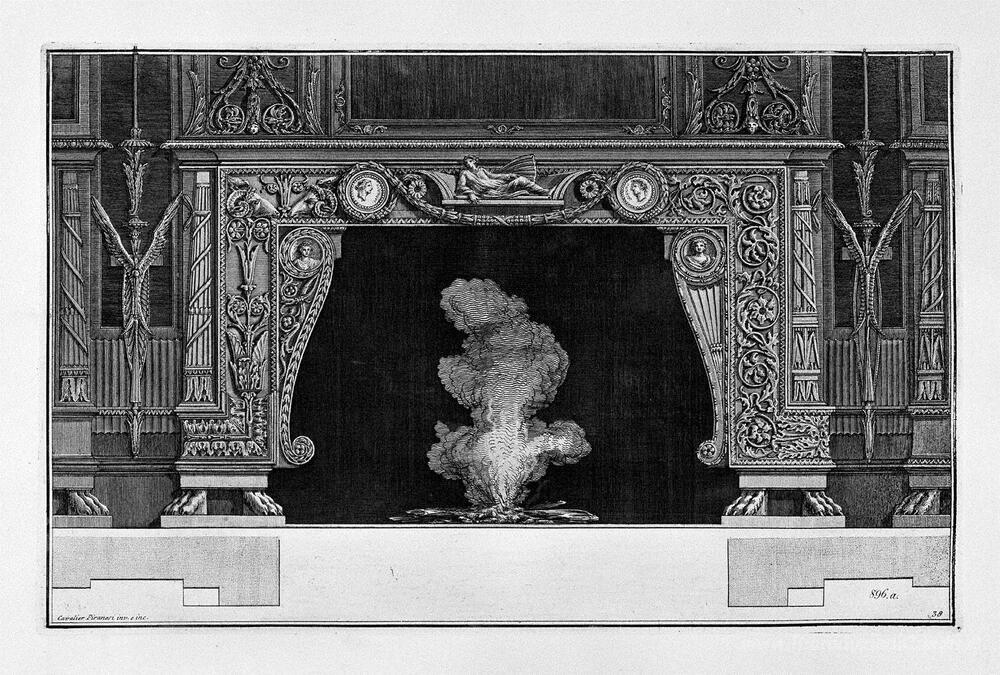Ti offriamo una riproduzione artigianale su tela dell'opera famosa 'Camino: due medaglie nel fregio di inghirlandata una figura sdra' di Giovanni Battista Piranesi, dal Museo delle Riproduzioni.