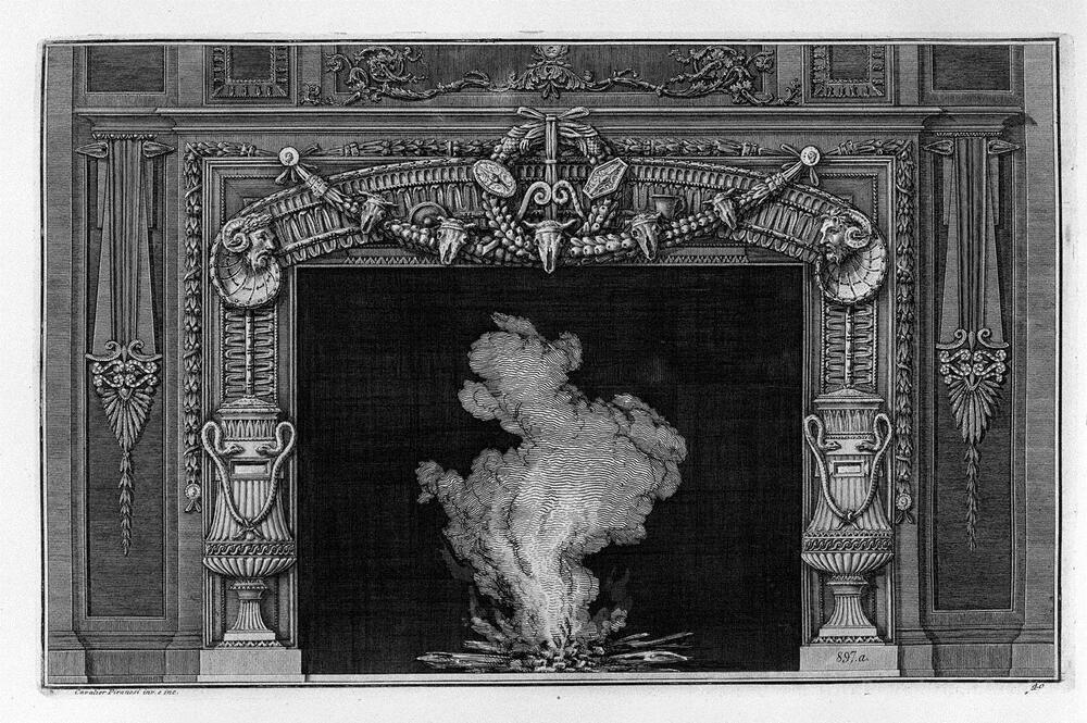 Ti offriamo una riproduzione artigianale su tela dell'opera famosa 'Camino: due vasi ai lati con i serpenti' di Giovanni Battista Piranesi, dal Museo delle Riproduzioni.