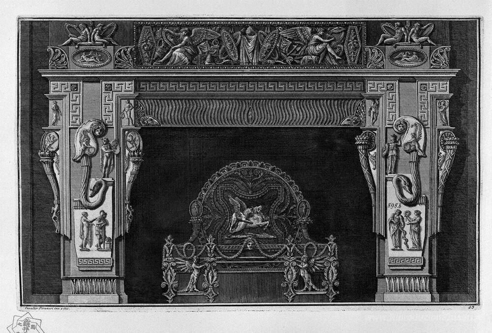 Ti offriamo una riproduzione artigianale su tela dell'opera famosa 'Camino: fregio con nervature e raschietti, e un greco, un ricco ' di Giovanni Battista Piranesi, dal Museo delle Riproduzioni.