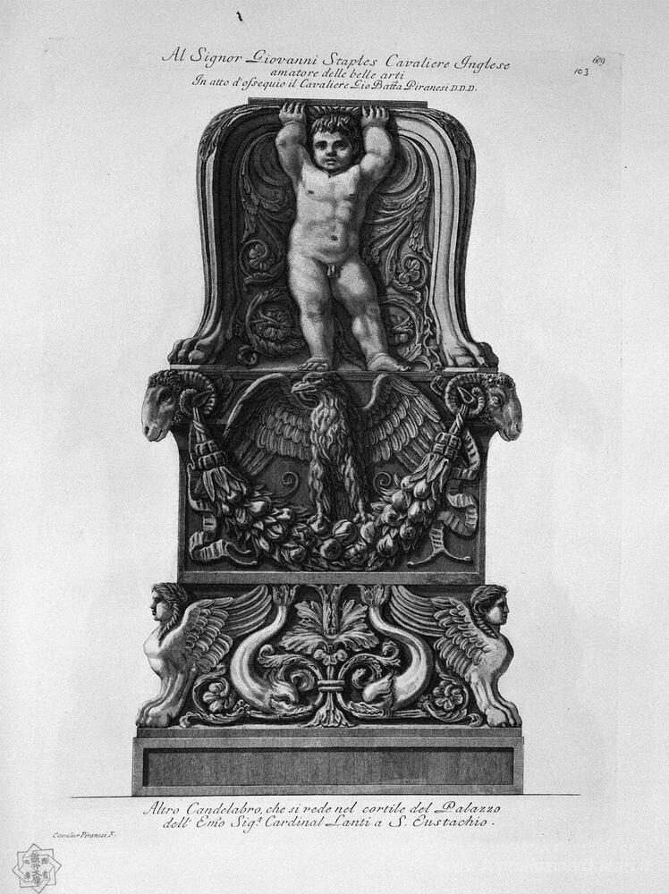 Ti offriamo una riproduzione artigianale su tela dell'opera famosa 'Candeliere nel cortile di Palazzo Lante a Sant'Eustachio' di Giovanni Battista Piranesi, dal Museo delle Riproduzioni.